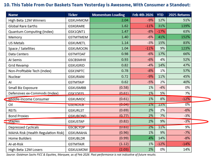 2. Under The Hood: At this point, it’s not a growth scare. Momentum trades & pockets of TMT are clearly the setter of price each day. Our generally US High Beta Momentum basket was -10% yesterday, its worst day since 2020 and 2nd worst day in the last 20 years. It’s barely a blip on the long-term chart. The difference between this episode and others is most seem to be struggling to pinpoint the exact reason for why (i.e. positioning, technicals, capex surprises, commodities, software worries spreading, etc). It’s not a consumer growth scare though.