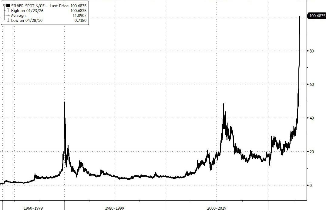 (Zero Hedge)—The precious metals complex resumed its upward trajectory overnight. Shortly after the US equity cash open, silver surged above $100 per ounce for the first time on record, while gold approached the $5,000 per ounce level.