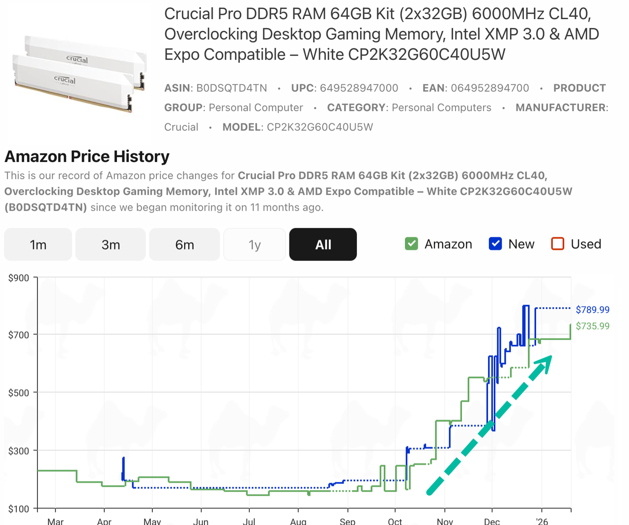 Amazon price-tracking website CamelCamelCamel shows a parabolic price surge in Crucial Pro DDR5 64GB RAM, rising from $145 to $790 in just six months. Anyone building a gaming PC to power a trading station must be furious, as the greatest memory crunch of our time is now underway and could worsen in the months ahead.