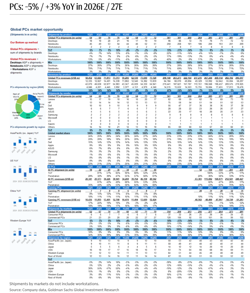 Goldman analysts led by Allen Chang have revised down global PC shipment forecasts for 2026-28, citing a sharp spike in memory prices as data centers worldwide soak up the supply of high-bandwidth memory.